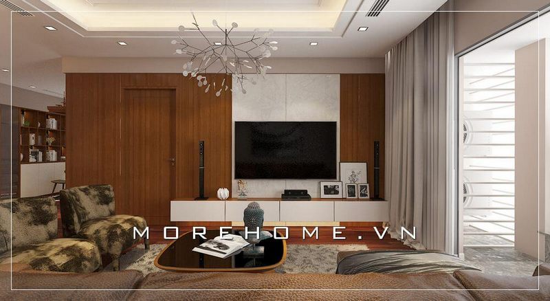 Kệ ti vi hiện đại và sang trọng là điểm nhấn trong căn phòng khách chung cư, thiết kế rất phù hợp cho diện tích căn nhà